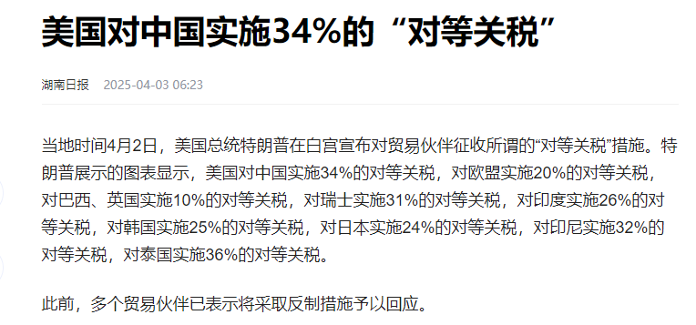值得注意的是,此前美国已对中国商品加征了20%的关税,而此次又加征了34%的关税。美国财政部长斯科特·贝森特确认,这将使得美国对中国商品加征的关税税率总计高达54%。